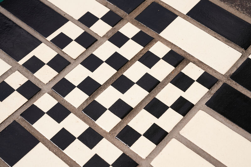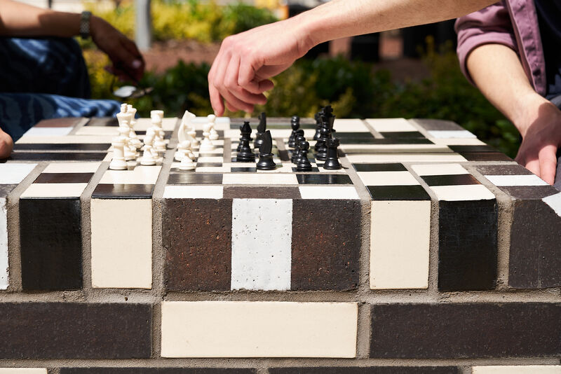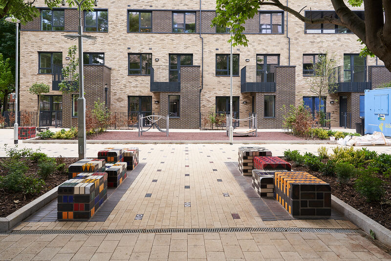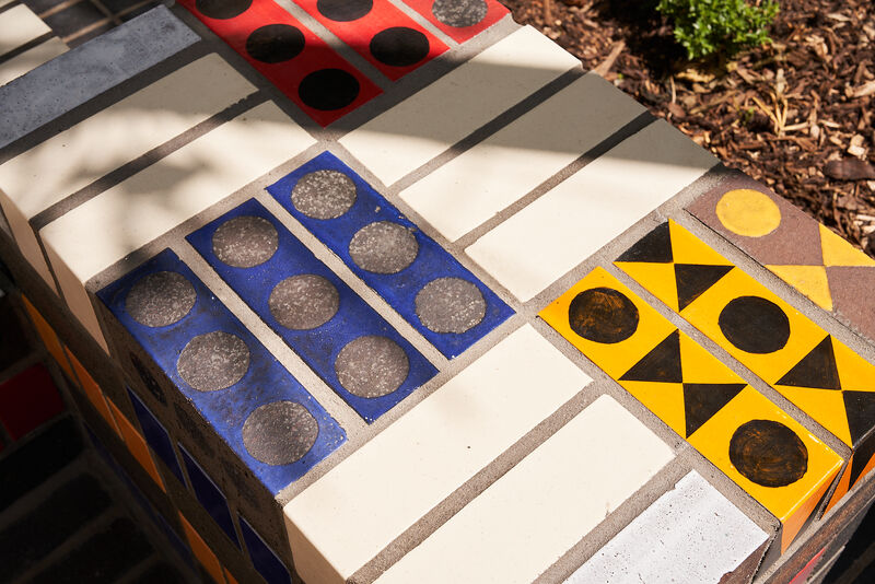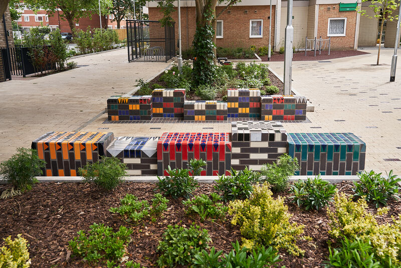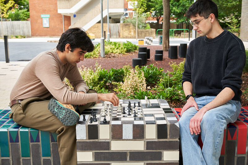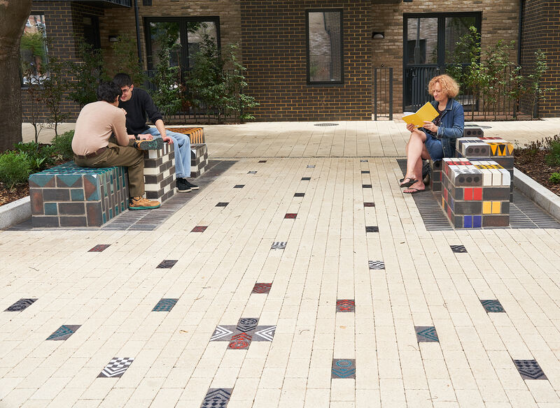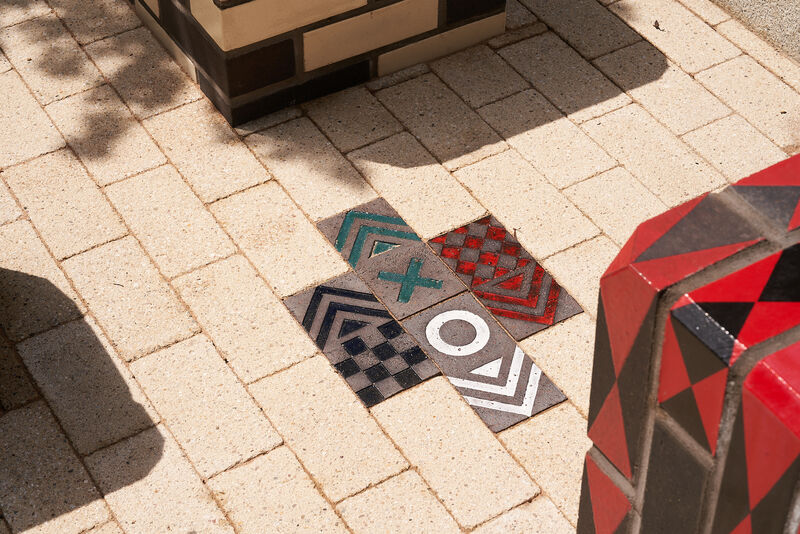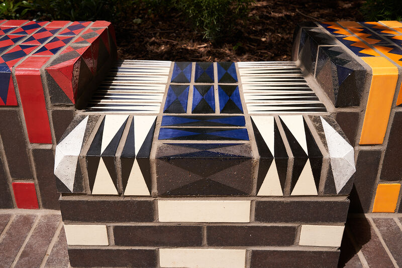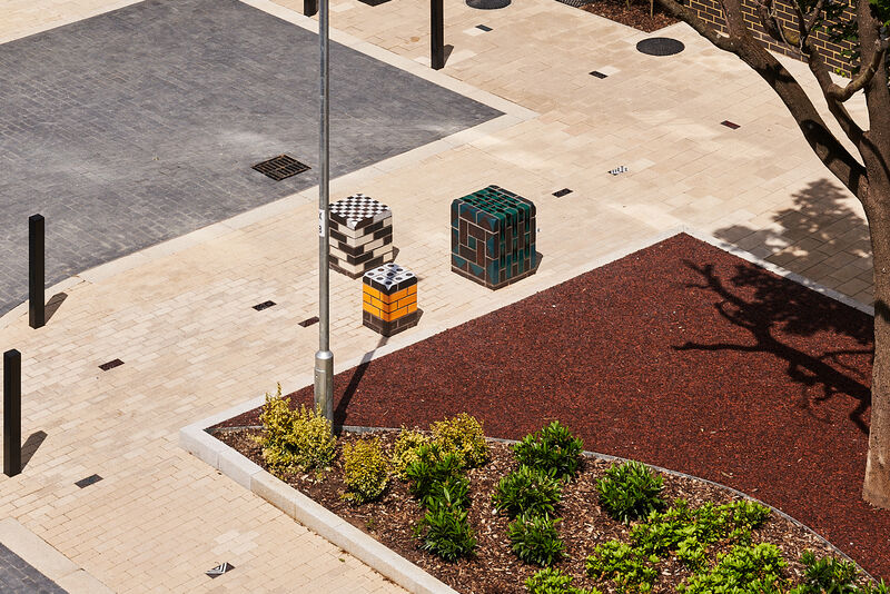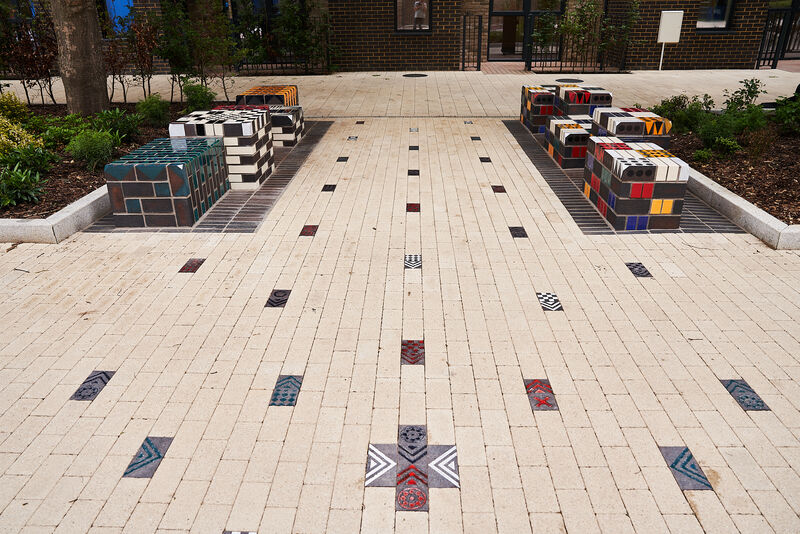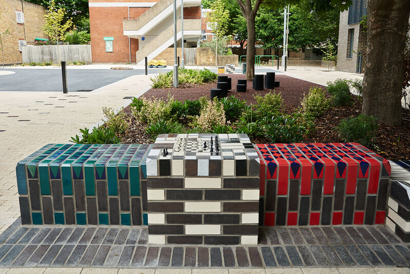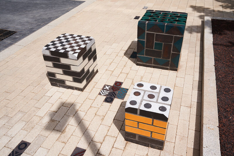 The work features two large glazed brick sculptural benches, clusters of modular seating cubes, and a series of decorative brick paviours that run through the site like a woven carpet. These elements incorporate embedded game boards - chess, backgammon, and noughts and crosses - encouraging social interaction across generations.