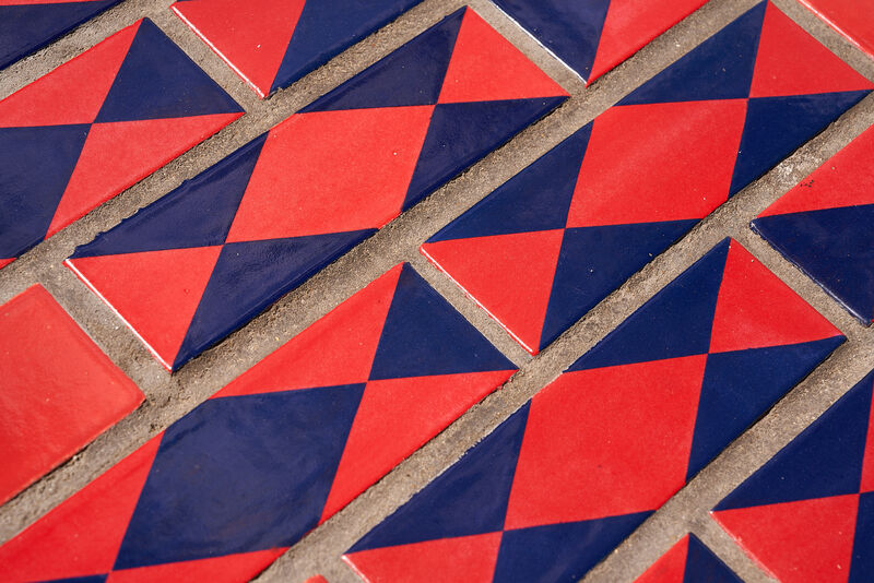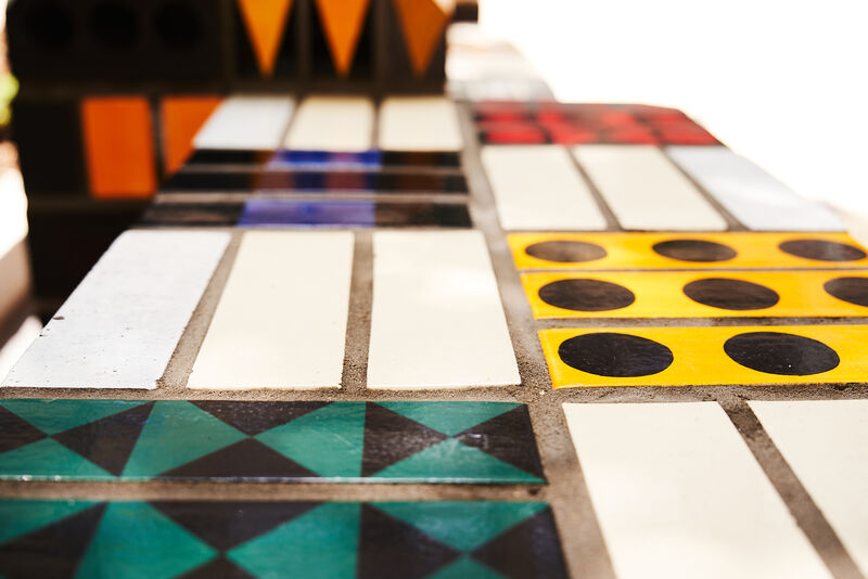 Randall Pattern Play by Maria Gasparian is a permanent public artwork commissioned by Wandsworth Council. Located within the Surrey Lane Estate in Battersea, the installation transforms Randall Close into a vibrant and engaging public space - an 'outdoor living room' that invites play, rest, and community interaction.