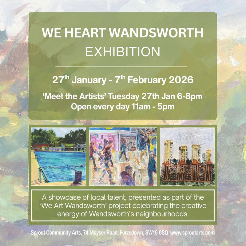 We Heart Wandsworth is the Sprout Arts artist members’ exhibition - a showcase of local talent, presented as part of the We Art Wandsworth project celebrating the creative energy of Wandsworth’s neighbourhoods. The exhibition brings together artists’ portrayals of local places and everyday moments, exploring community and culture, nature and the environment, and personal experiences connected to Wandsworth. This project is our collaboration with Battersea arts Centre and Putney School of Art and Design as part of the London Borough of Culture programme.