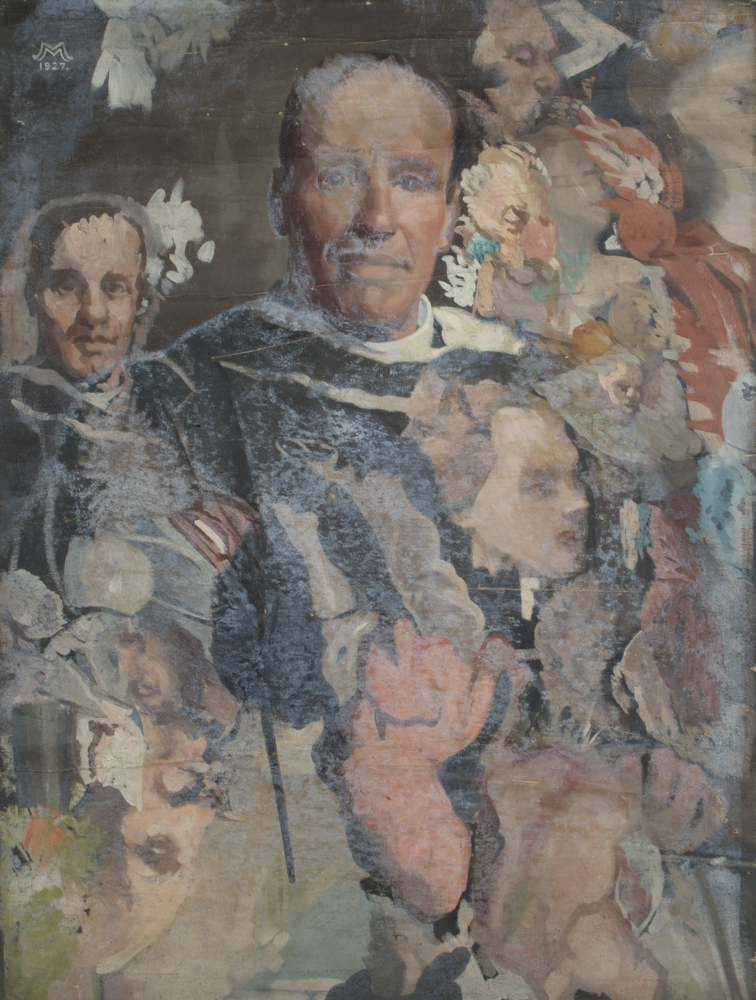 Montage with several full faces and several other incomplete faces, all male, in different areas of the painting. The faces seem to represent the same person at different times of his life. The only non human face is that of a lion or big cat. The main face is the biggest, also seemingly the older, is located in the centre of the painting. Abstract elements in red, blue and green colours are dotted around the painting.