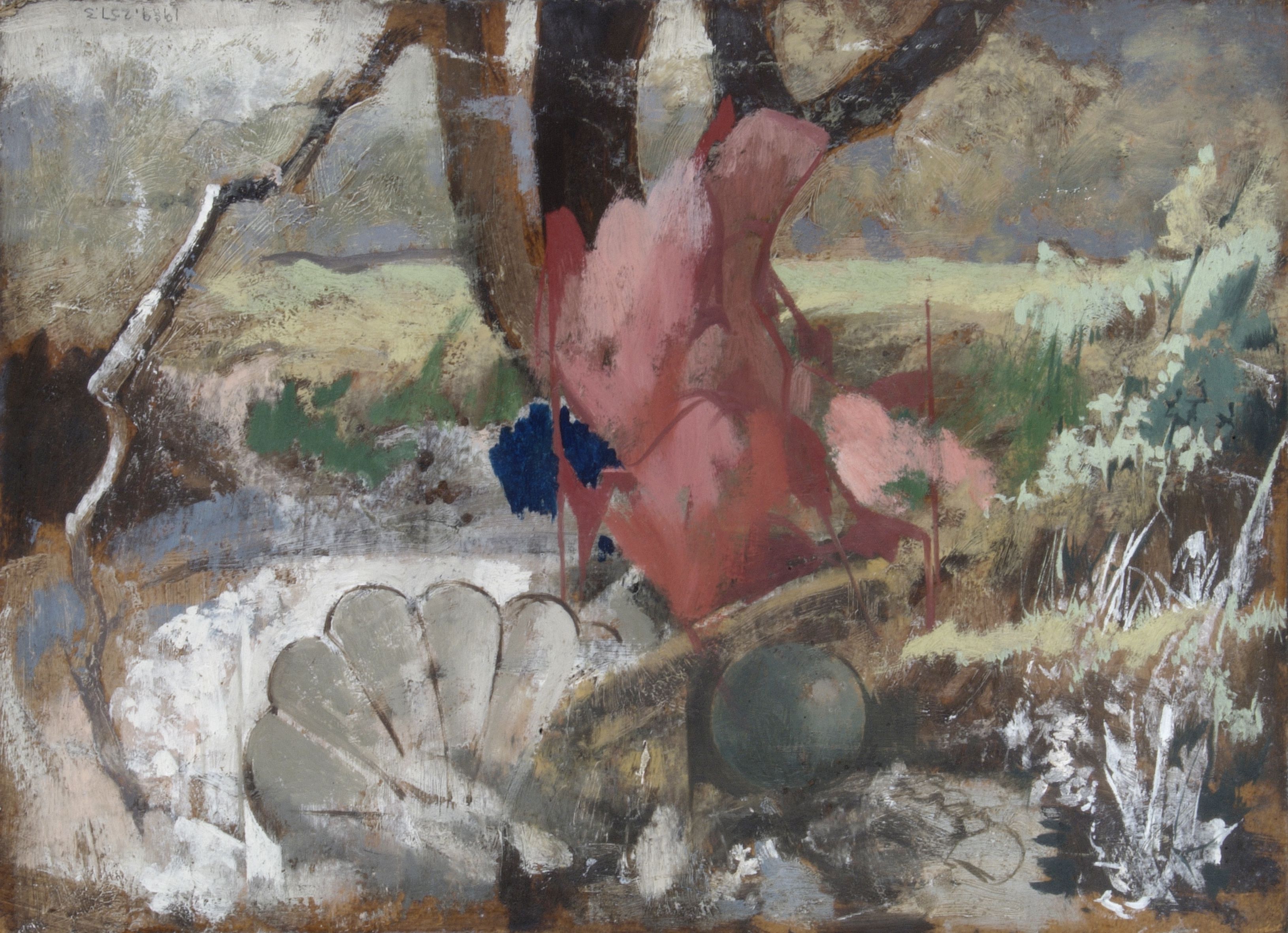 This painting presents an abstract landscape filled with a variety of shapes, colours, and textures. At the centre, there’s a brown tree trunk with branches extending towards the top right. To the left, there’s a patch of blue, and below it, an area with white and grey tones that might suggest rocks or water. A vibrant pink form stands out in the middle, possibly representing flowers or foliage. In the foreground, there’s a circular grey object that looks like a stone next to white seashell shapes on a brown earthy ground. The background hints at greenery and a blue sky with soft white clouds.