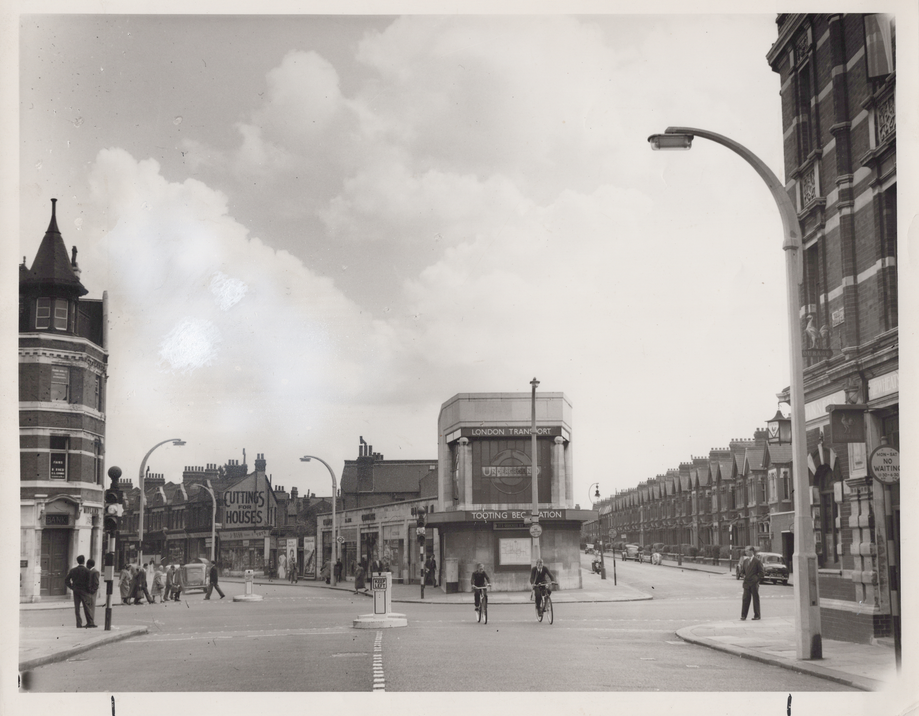 Gelatin-silver print depicting a black and white street scene featuring Tooting Bec Station with signage for "London Transport. Tooting Bec Station" and "Cuttings For Houses.". Shops and advertisements all have signage, such as "J. Bush. Toys" or "Persil" advertisment. Cyclists and pedestrians animate the view, while terraced houses and vintage street lamps line the road.