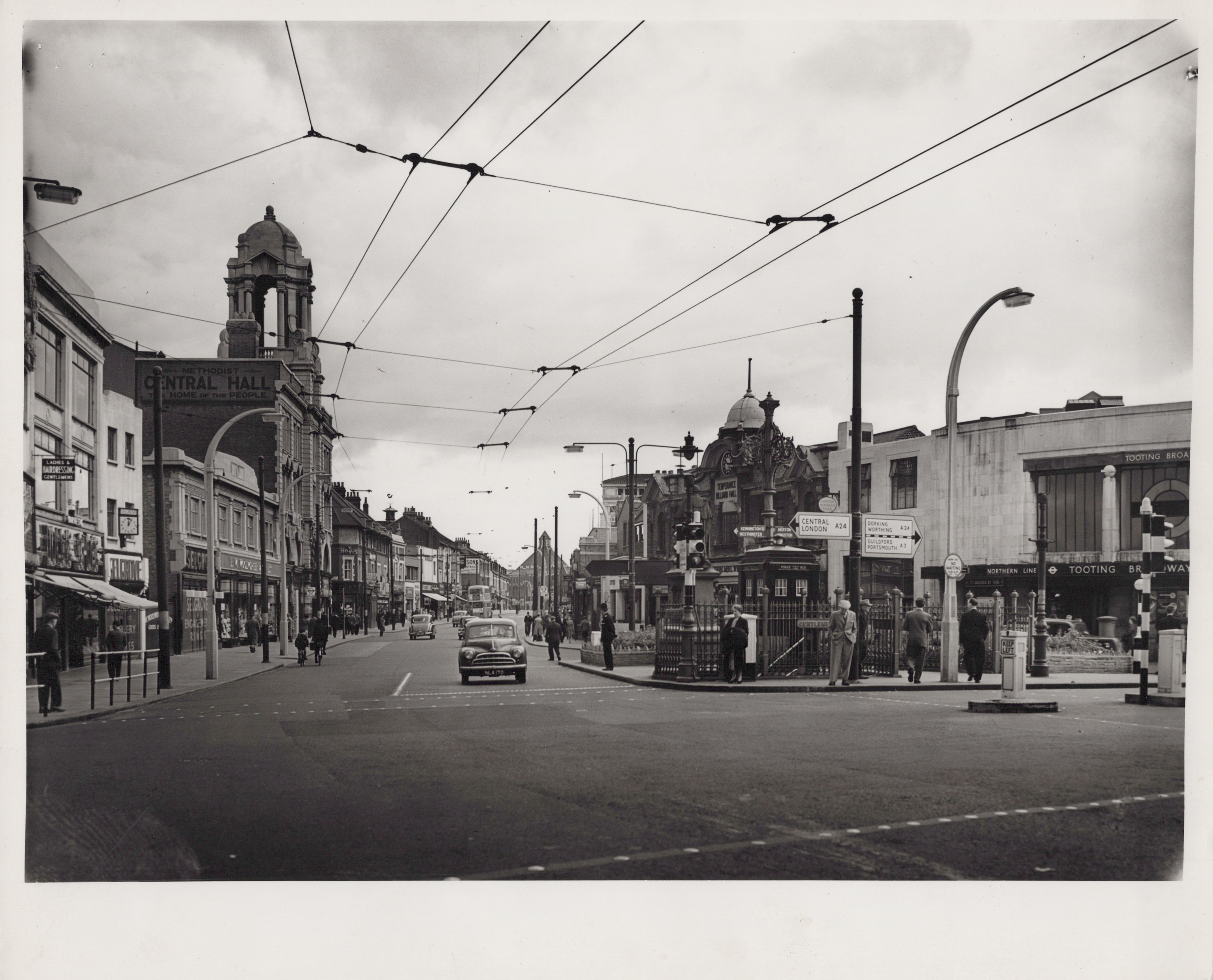 Gelatin-silver print, black and white photograph capturing Tooting High Street outside Tooting Station in 1956. On the left side, the imposing façade of the Methodist Central Hall dominates the scene, its name clearly visible on the side façade.