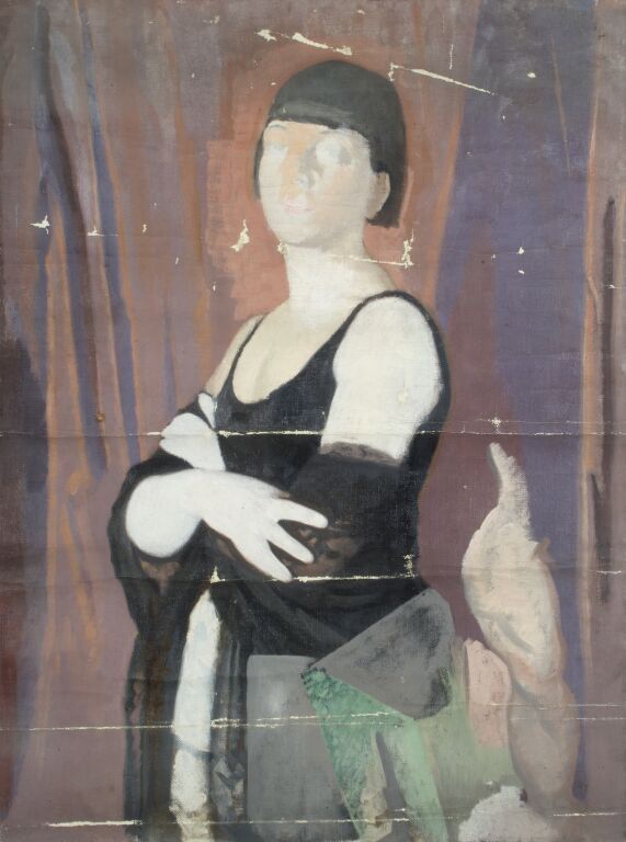 The painting depicts a standing figure wearing a black sleeveless top and a black and grey see-through foulard that covers part of her arms. She is facing the viewer but she doesn't have finished facial features, as if the painting wasn't finished. Her arms are crossed. The background features muted tones, with vertical lines suggesting drapery or a wall. The Brush strokes create texture, and the colour palette is subdued with hints of green and pink against dominant greys and blacks. The painting has a number of horizontal cracks in several areas as a result of being rolled.