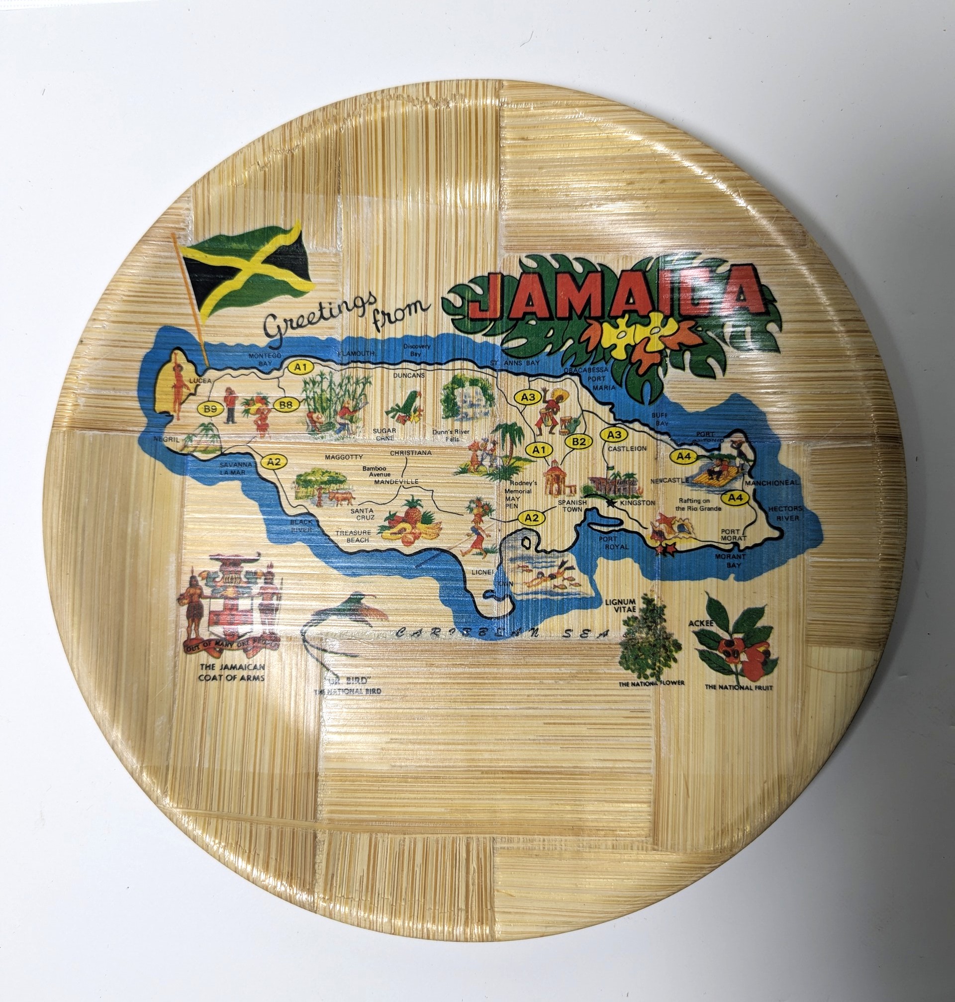 This bamboo decorative souvenir plate presents a stylized map of Jamaica, adorned with illustrations of the island’s flora, fauna, landmarks, and cultural symbols. The Jamaican flag appears in the top left corner alongside the message “Greetings from JAMAICA.” At the bottom left is a depiction of The Jamaican Coat of Arms and the Ur bird while the bottom right features labelled images of native plants.