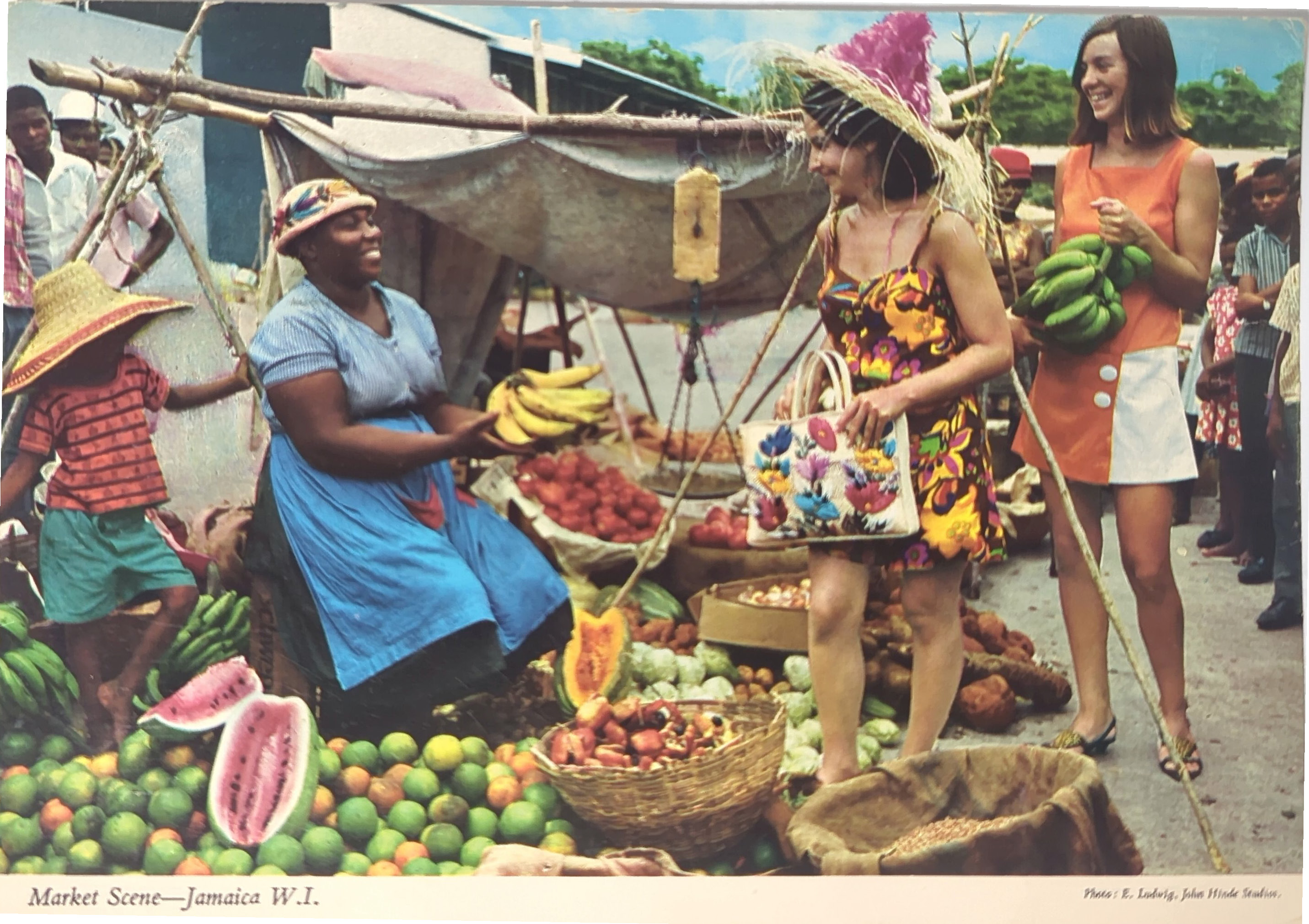 This postcard depicts a market scene in Jamaica. A couple of tourists, wearing colourful dresses with a style that places this photo in the 60s-early 70s, are buying fruit from a market stall. One of the women hold bananas while the other is carrying a bright floral straw handbag and wearing a straw pink hat. A woman in a blue dress, the owner of the stall, sits on the left, holding bananas while a child beside her wears a striped shirt and a straw hat that covers his face. The market stall is overflowing with tropical fruits like watermelons, mangoes, apples, and bananas, arranged in baskets. Other marketgoers and stalls are visible at both sides of the central composition, adding depth and atmosphere to the scene.