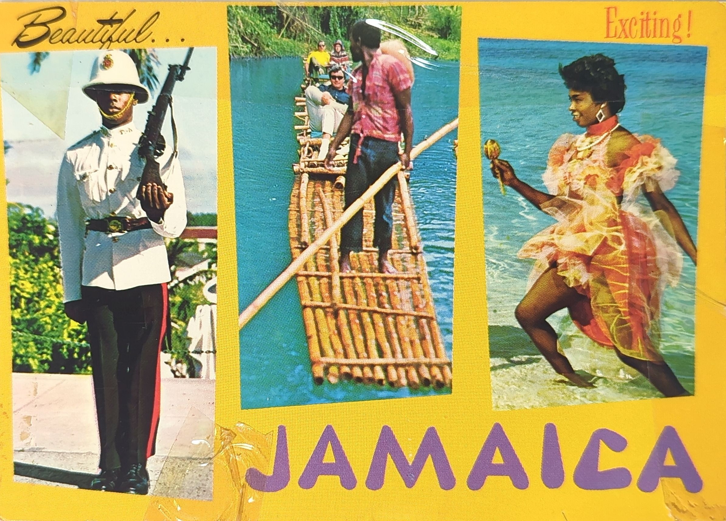 Postcard from Jamaica showing 3 photos over a bright yellow background. In the first image a Jamaican soldier stands guard with a rifle over his shoulder. On the second image a group of tourist are being taken in a bamboo raft, with a black man standing at the front guiding the raft with a long pole. His face is facing away to us looking at the rest of the people in the raft. The last panel show us a black woman dressed in a bright pink and yellow ruffle dress, possibly a dancing attire, holding a maraca in one and. She is standing at the shore of a beach, her feet in the water. The words "Beautiful … Exciting! Jamaica' are scattered around the composition.