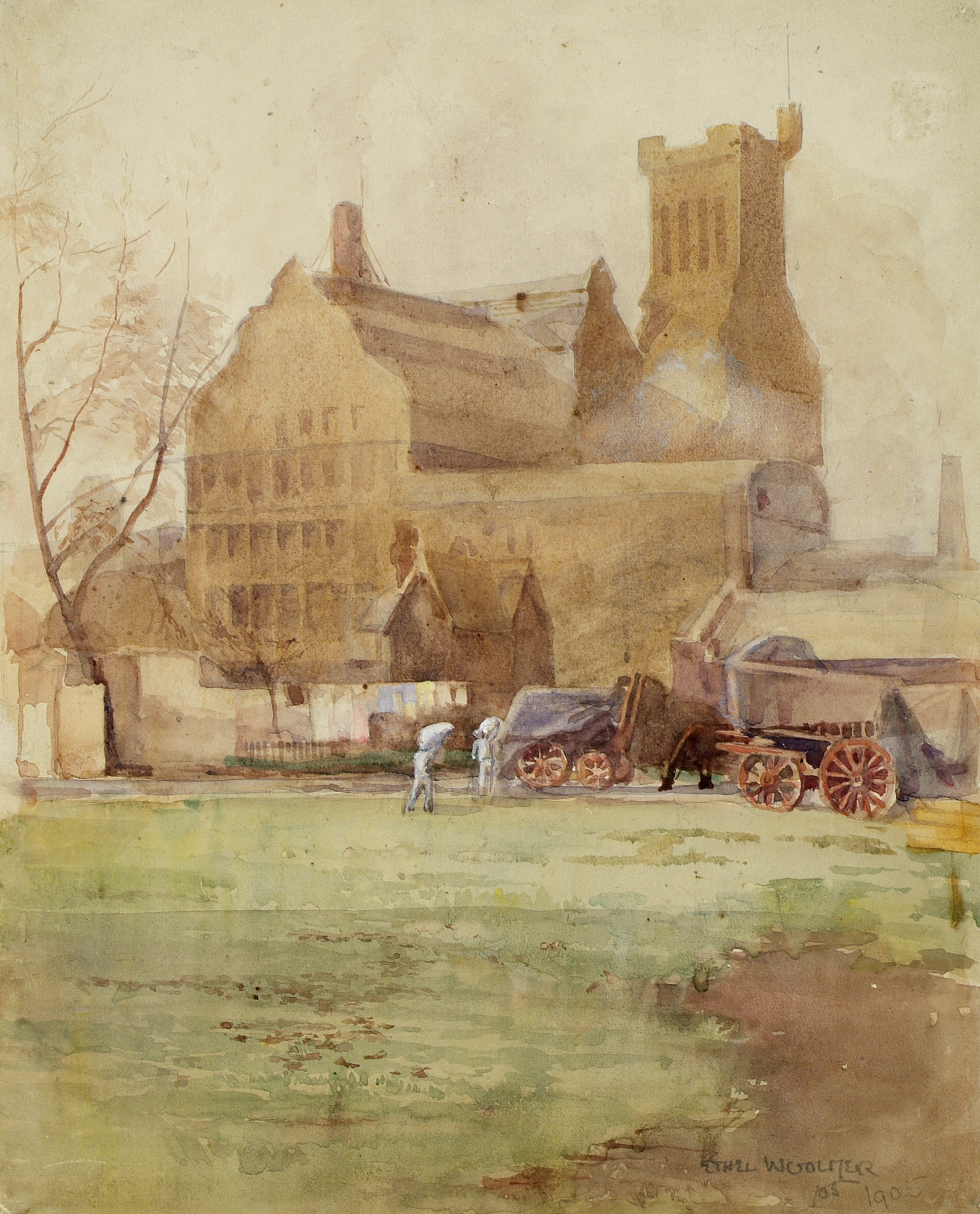 Watercolour painting by Ethel Woolmer depicting Flour Mills, Battersea. 1905