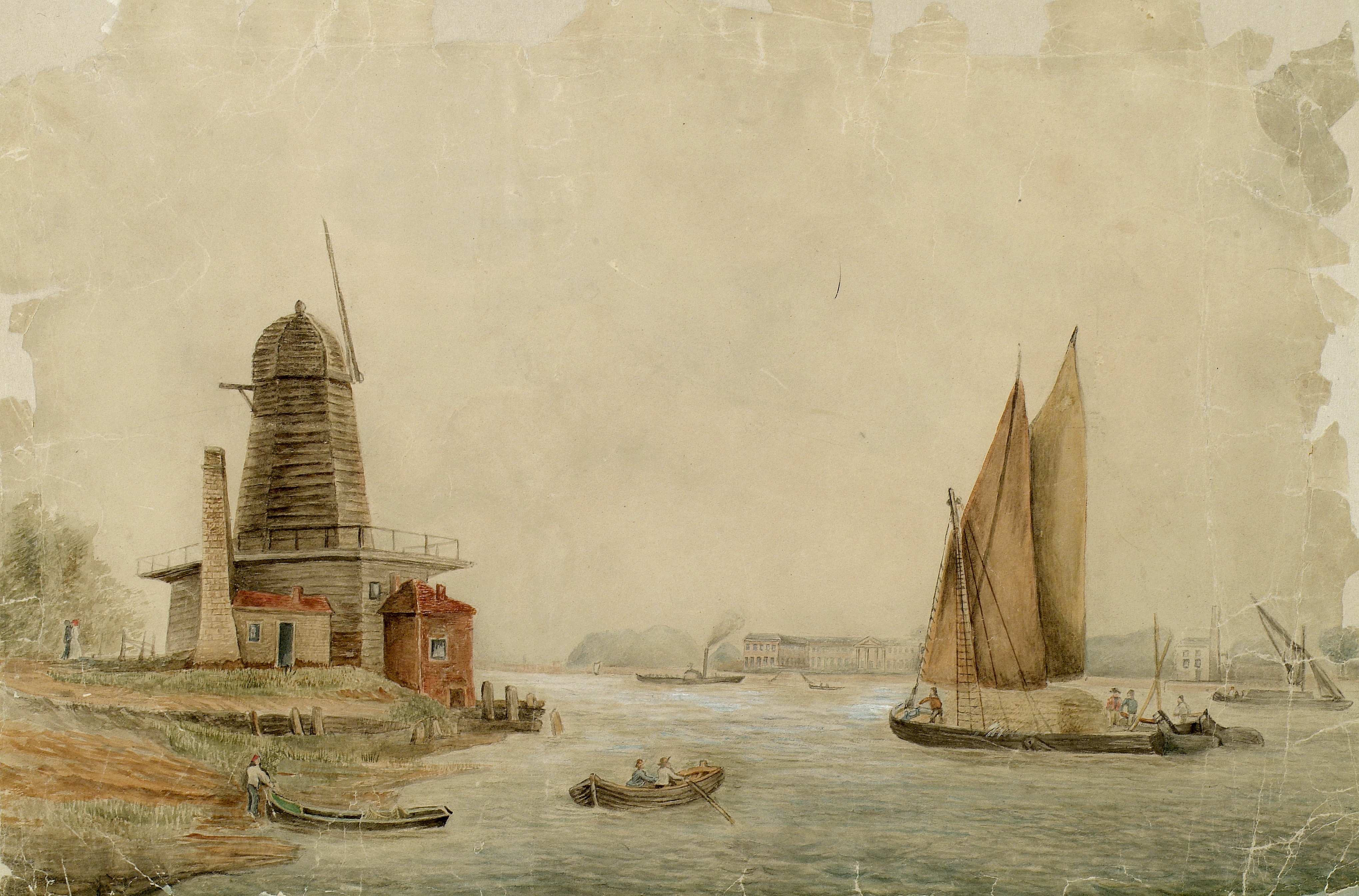 This nineteenth century painting shows the Thames at Battersea as a working river. It depicts a large windmill on the south bank and a barge with hay, a paddle steamer and wherries beyond. There is a distant view of Chelsea Hospital on the opposite bank.