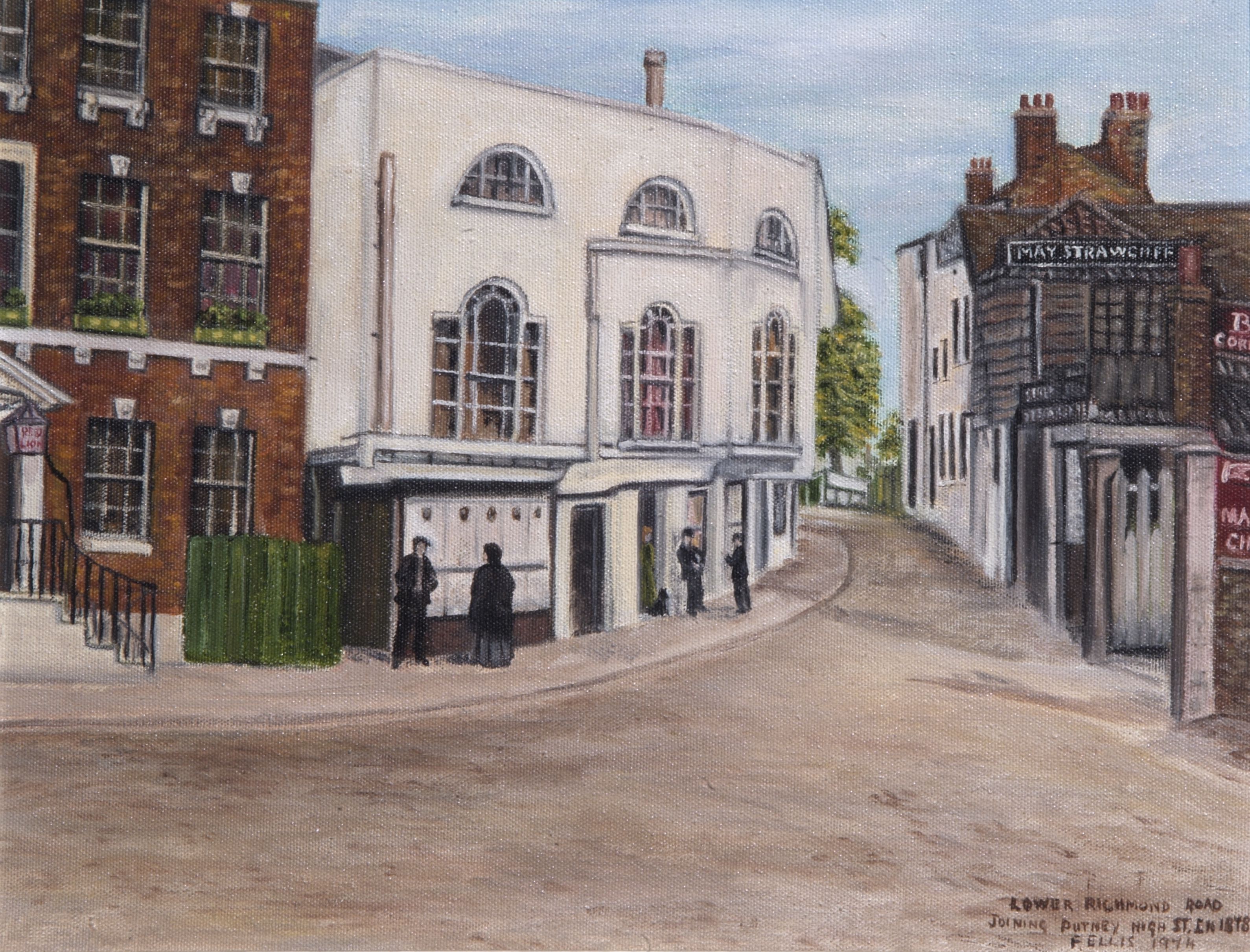 Oil painting by F. Ellis depicting Lower Richmond Road Joining Putney High Street, 1878. 1974