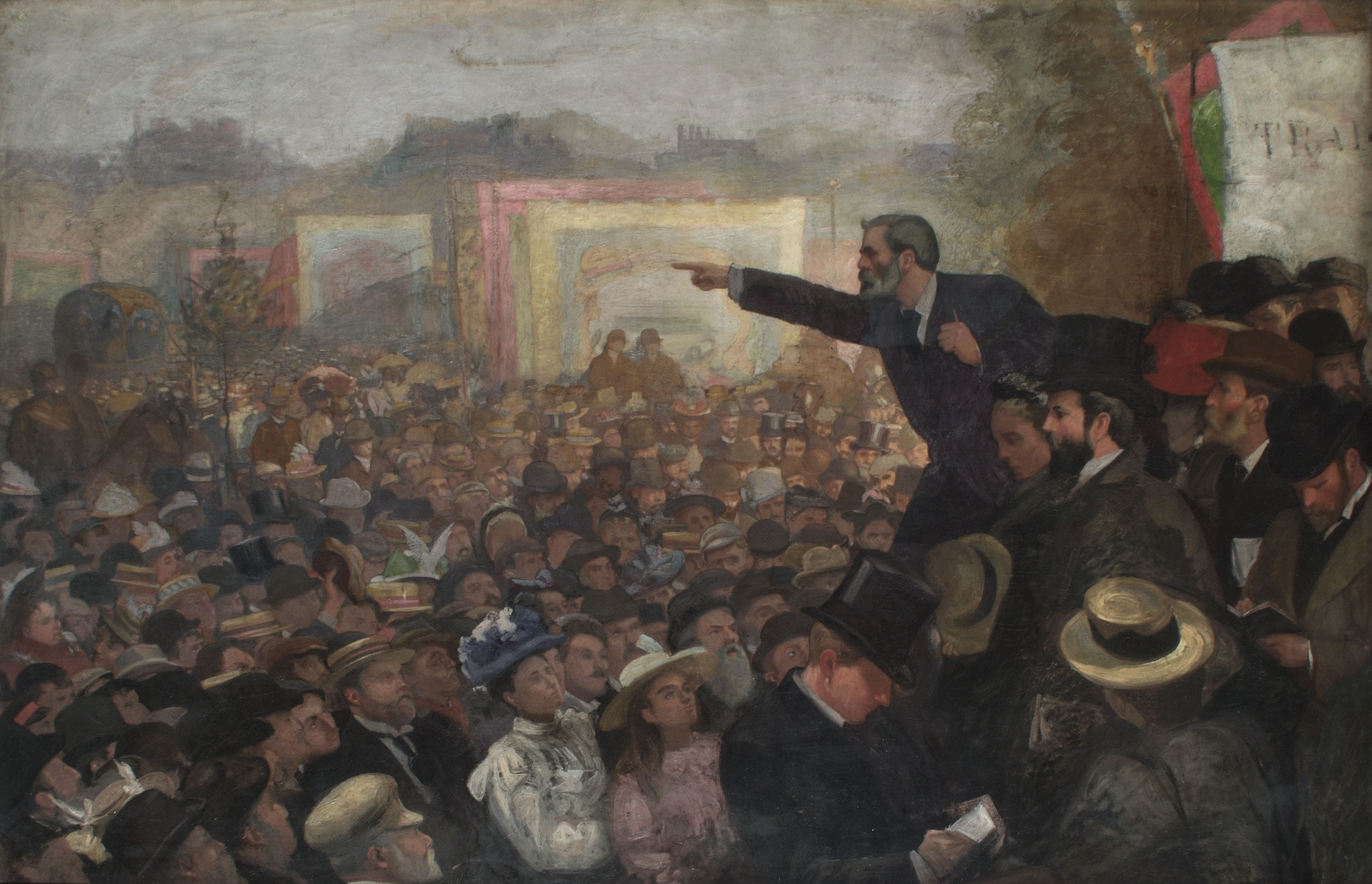 Oil painting by Alexander Joseph Finberg depicting John Burns addressing and open audience . 1897