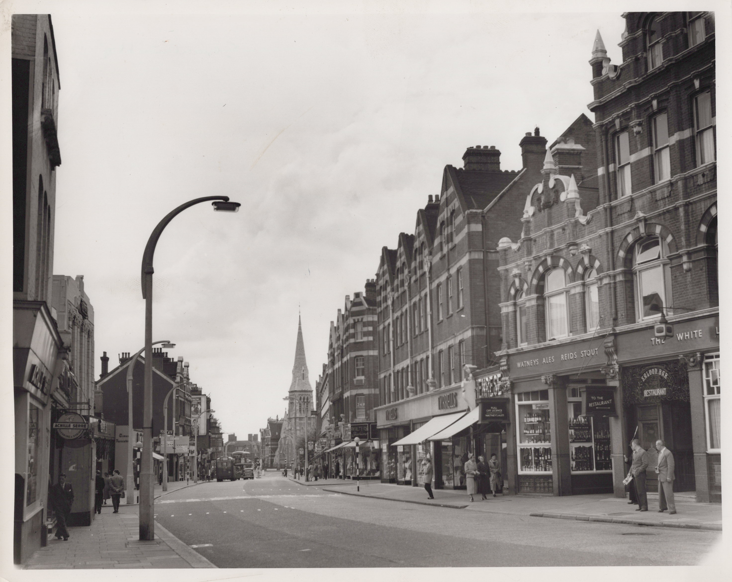 Gelatin-silver print, black and white photograph capturing Streatham High Road with shops lining both sides of the street. We can see the English Martyrs Catholic Church in the background.