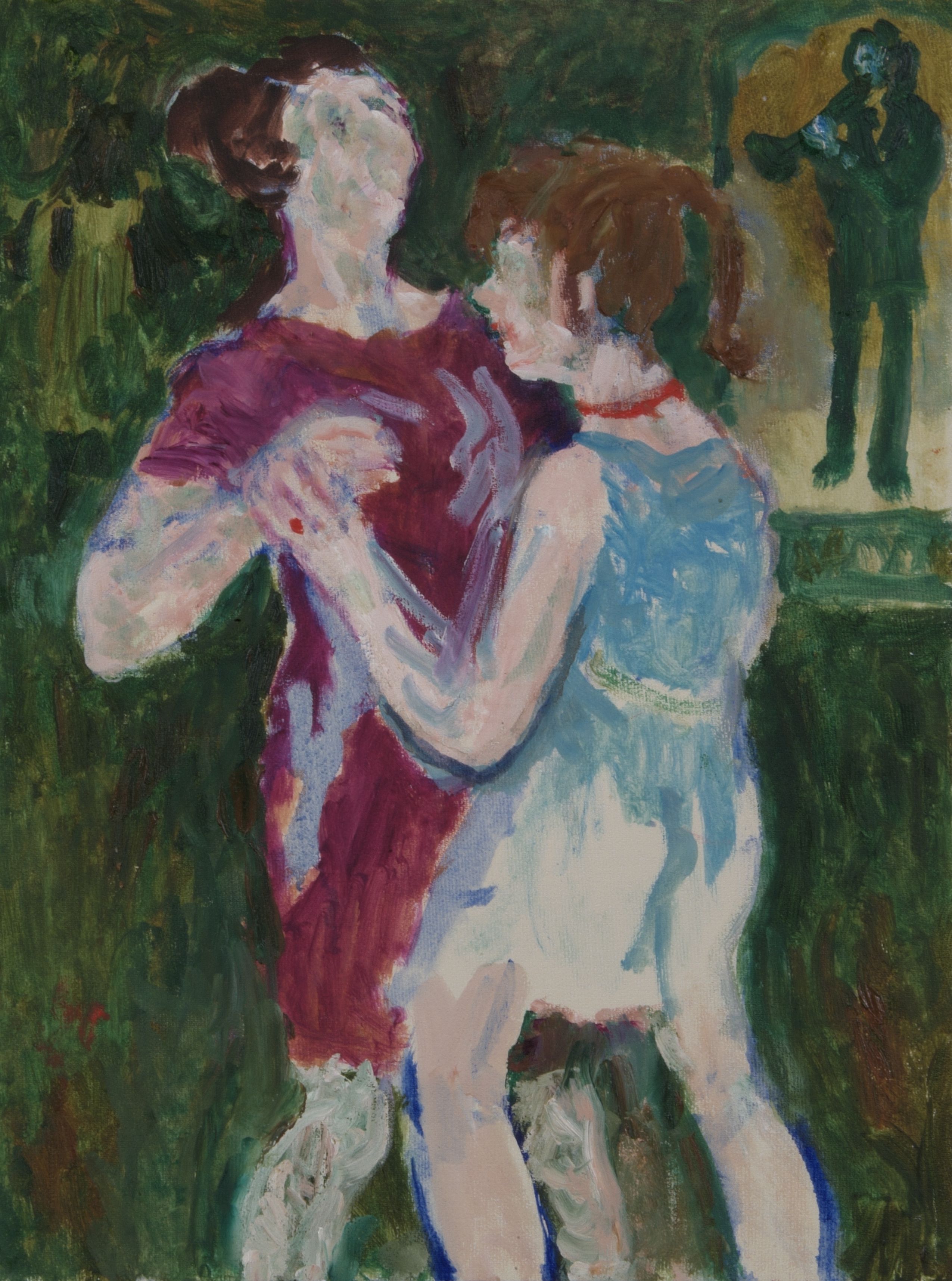 Acrylic painting by William Halle depicting a Woman and Girl Dancing in a Park. 1991.