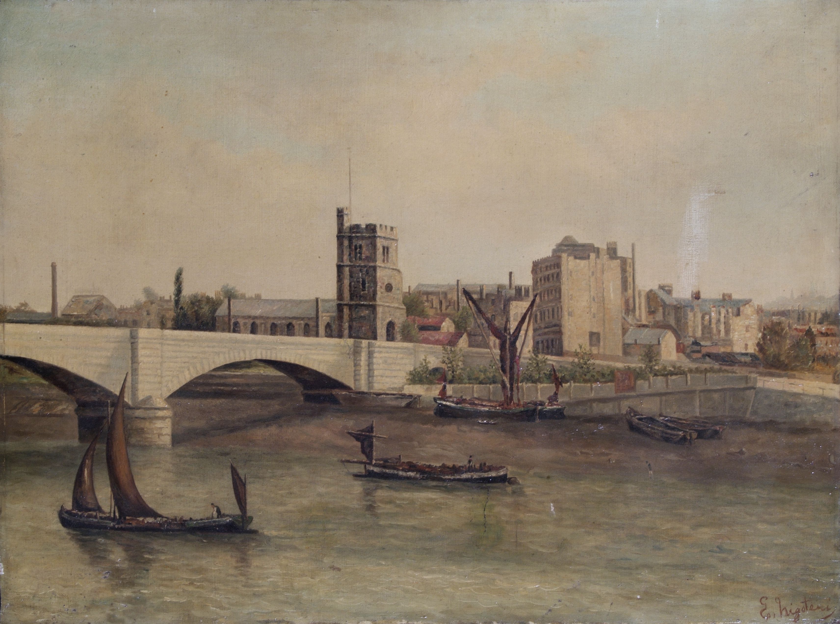 Oil painting by E. Higoteri depicting Putney Bridge, London. circa 1890.