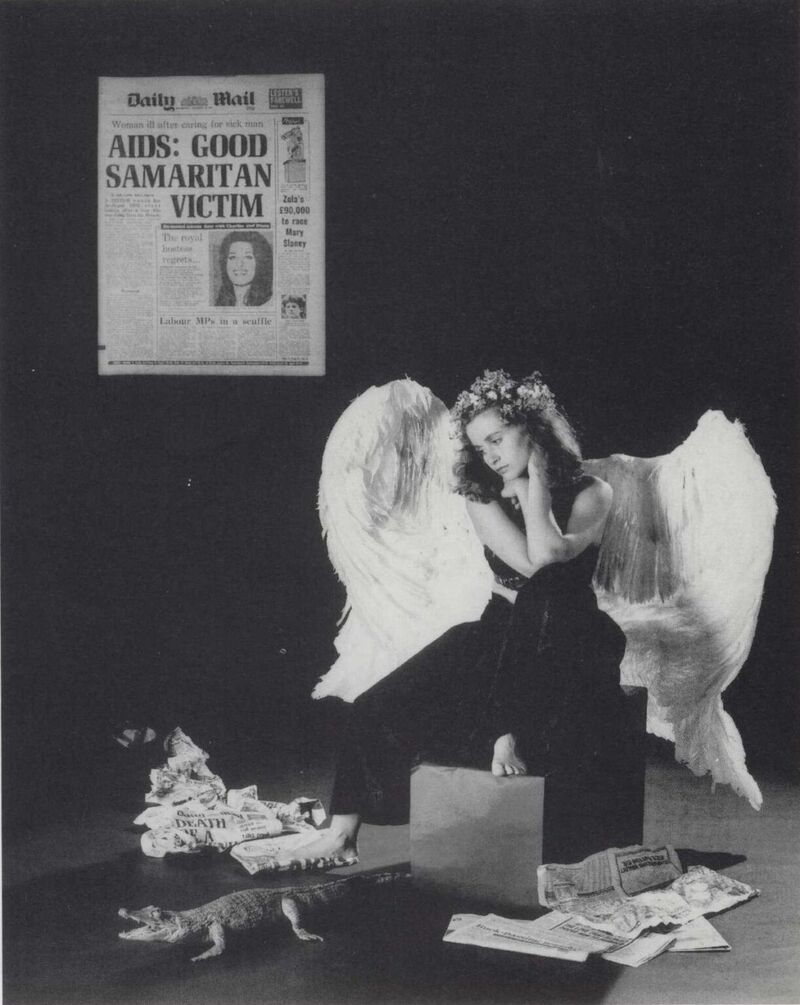 Tessa Boffin’s triptych Angelic Rebels (1989) remains one of the most written about works in the exhibition and was recently reshown as part of Hot Moment at Auto Italia, London in 2020. The work reimagines Albrecht Dürer’s Melancolia I or Angel of Melancholy (1514) in an AIDS climate. Durer’s angel is a femme lesbian, slumped and rifling through the tabloids of the age. Boffin’s photographs problematise the idea that Lesbian sex was clean, safe and ‘pure’. The angel/lesbian learns about safer sex practices and through this education her potential to be an ‘angelic rebel’ is realised. She ascends out of her chair, half dressed in kink gear. Her partner’s grip tethers her. In this grounded flight the message of a supported safer sex is translated.