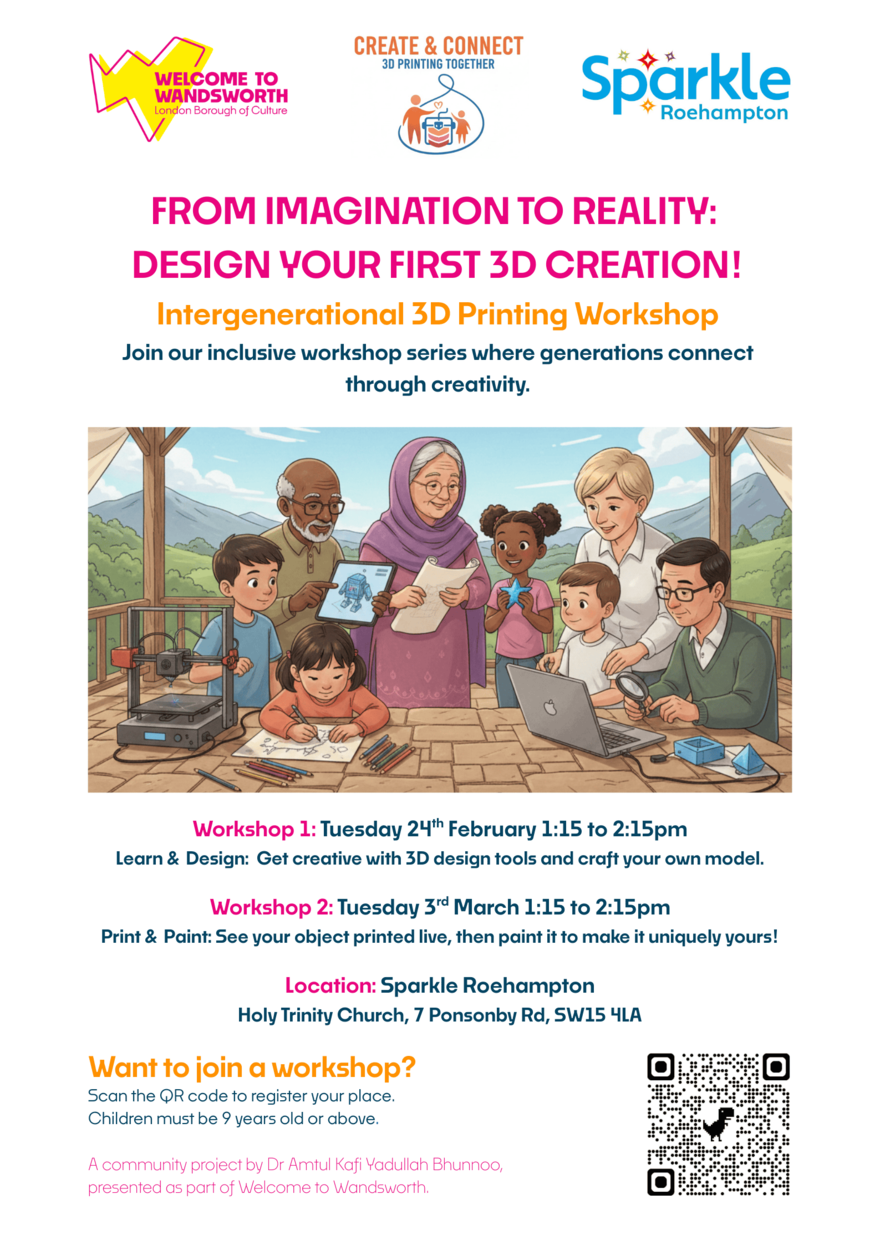 Create & Connect is a free, two-part intergenerational 3D printing workshop presented by artist Dr Amtul Kafi Yadullah Bhunnoo in collaboration with Sparkle Roehampton, as part of Welcome to Wandsworth – London Borough of Culture 2025.